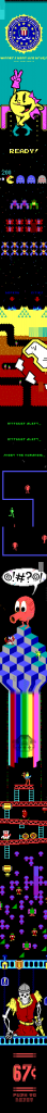 Donkey Kong's scaffolding eventually resolves, dumping a final barrel into the playfield of Atari's Centipede (1981), which is populated not with insects but the Grunt and Hulk robots of Williams' 1982 Robotron: 2084. Rounding the bend, that scene resolves into a background of the keys-on-chains of Nintendo's 1982 Donkey Kong Junior with a skeletal Dirk the Daring from one of Dragon's Lair's (1983) countless death sequences.
